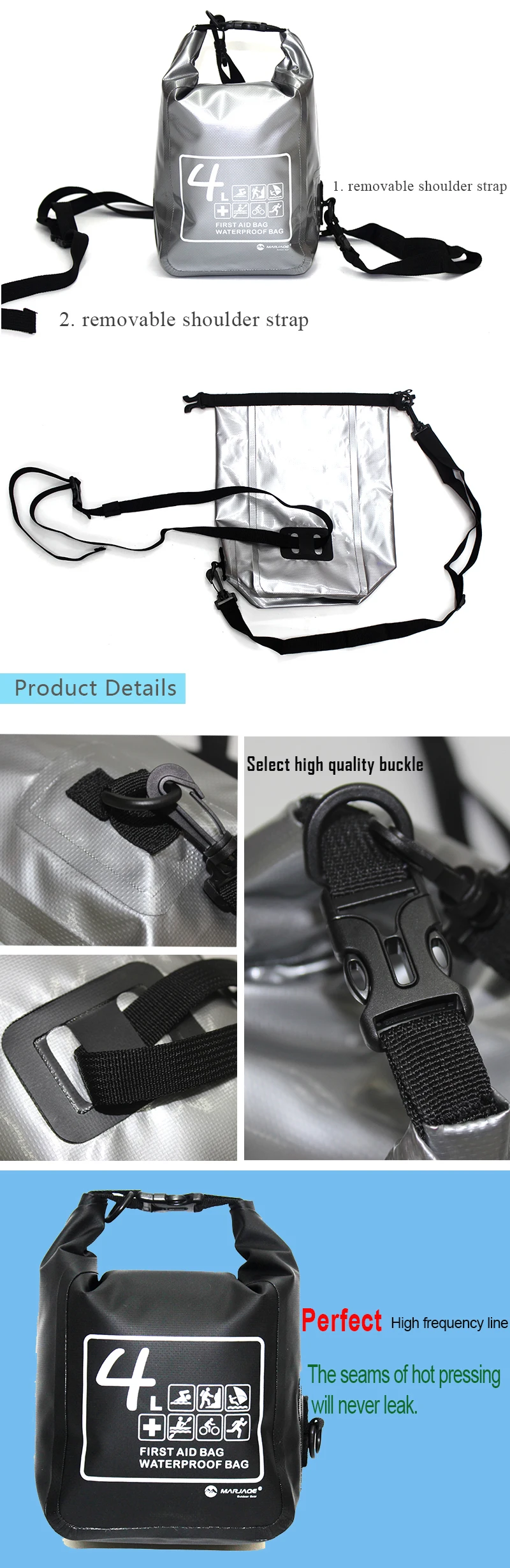 1.Square design, suitable for storage and storage of essential medicines and ambulances outdoors, which is waterproof and can also be used for small personal items such as mobile phones and wallets 2.Accessories: single shoulder strap + belt 3. Waterproof grade: IPX6
